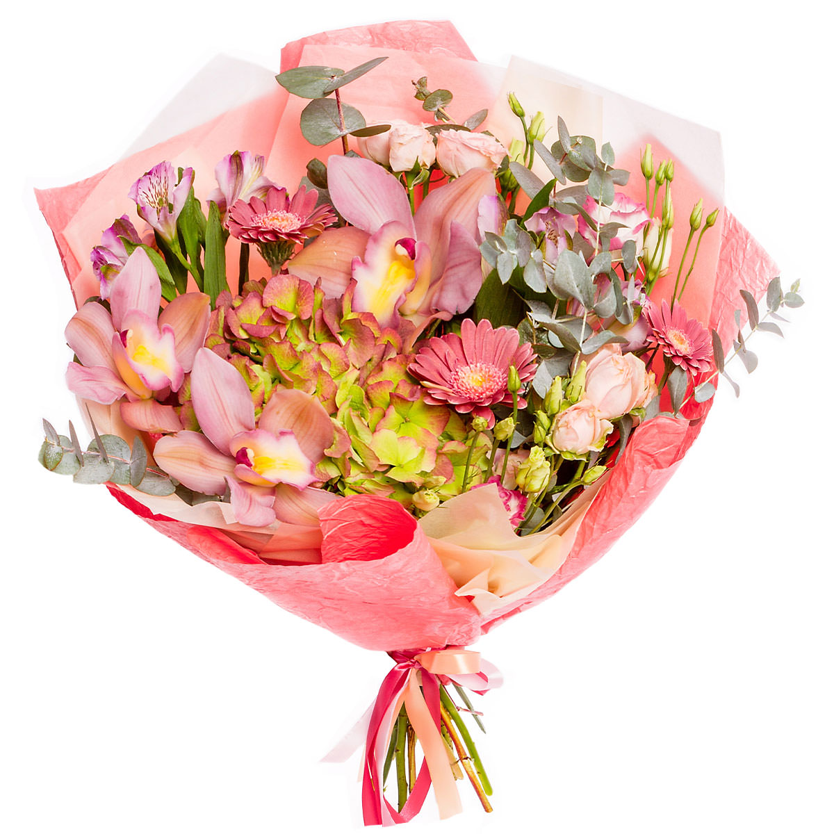 Гортензия розово-зеленая, орхидея розовая, альстромерия розовая, гербера розовая, эустома розовая, эвкалипт. Упаковка (лента, пленка, крафт, сетка, пленка матовая)