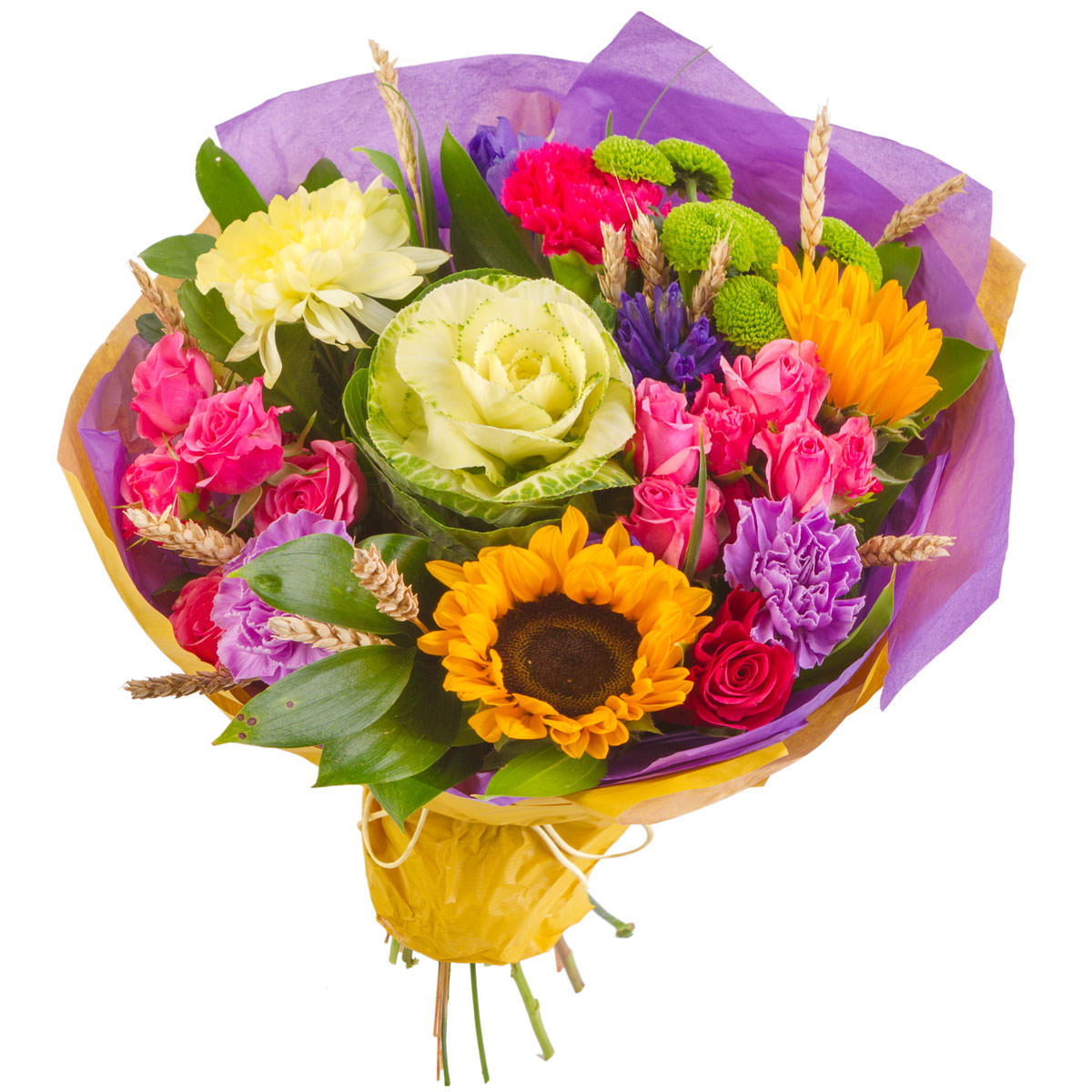 Подсолнух, роза кустовая розовая и красная, брассика, гвоздика фиолетовая, хризантема кустовая зеленая, хризантема одноголовая желтая, колос. Упаковка (лента, пленка, крафт, сетка, пленка матовая)