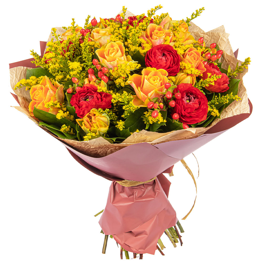 Ранункулюс красный, роза одноголовая оранжевая, гиперикум, солидаго. Упаковка (лента, пленка, крафт, сетка, пленка матовая)