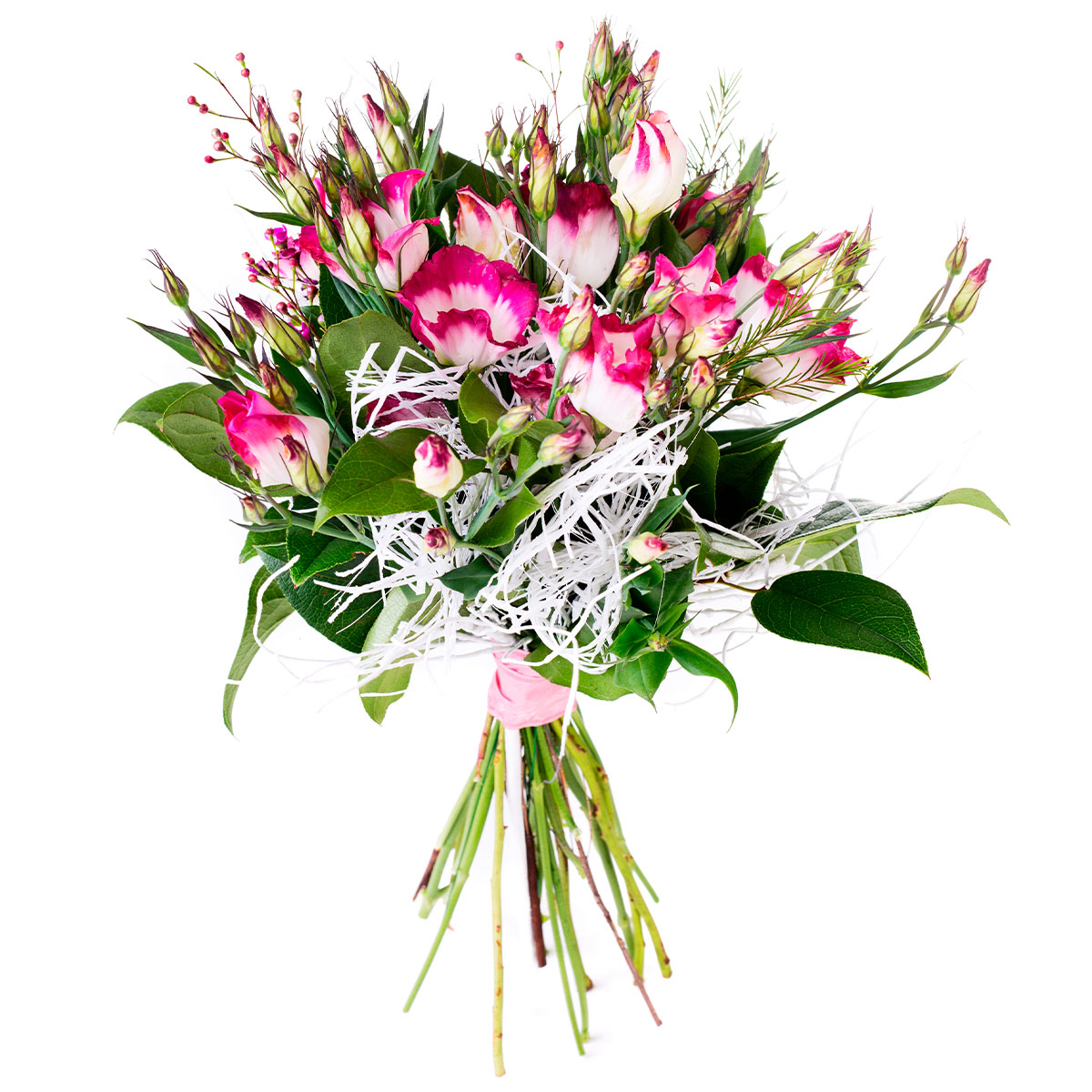 Эустома бело-розовая, зелень. Упаковка (лента, пленка, крафт, сетка, пленка матовая)