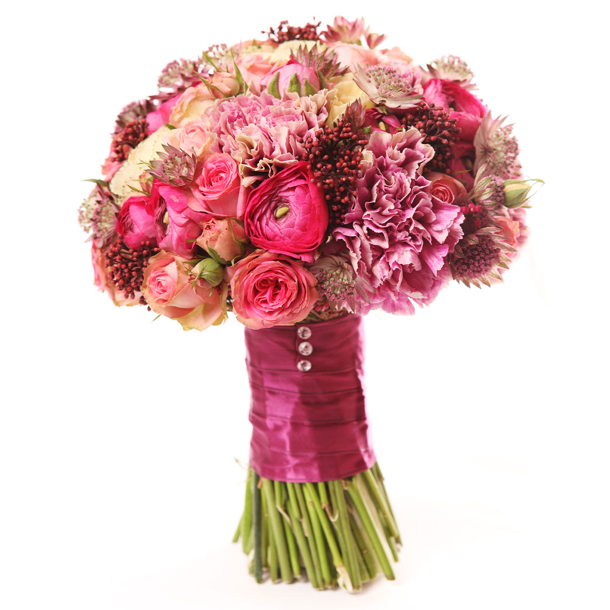 Ранункулюс розовый, роза кустовая розовая, гвоздика розовая, озотамнус, сухоцвет. Упаковка (лента, пленка, крафт, сетка, пленка матовая)