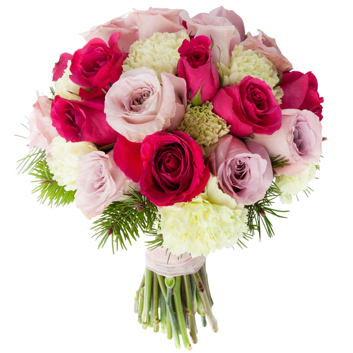Роза одноголовая розовая и сиреневая, гвоздика белая, пихта. Упаковка (лента, пленка, крафт, сетка, пленка матовая)