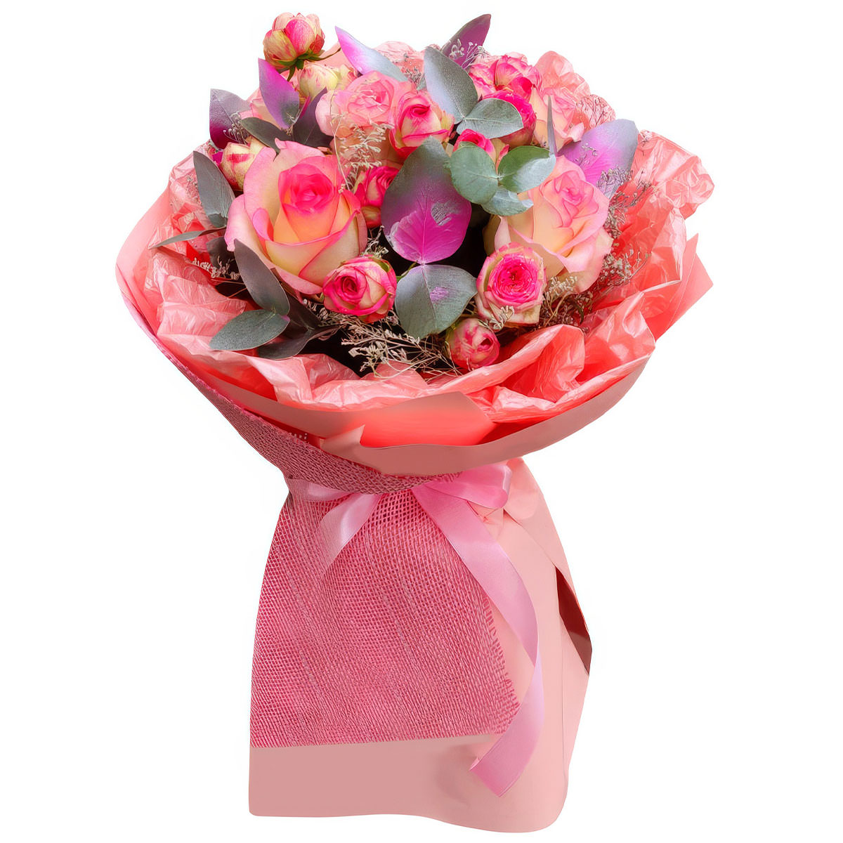 | Состав | Кустовые розы, Розы, Эвкалипт |
