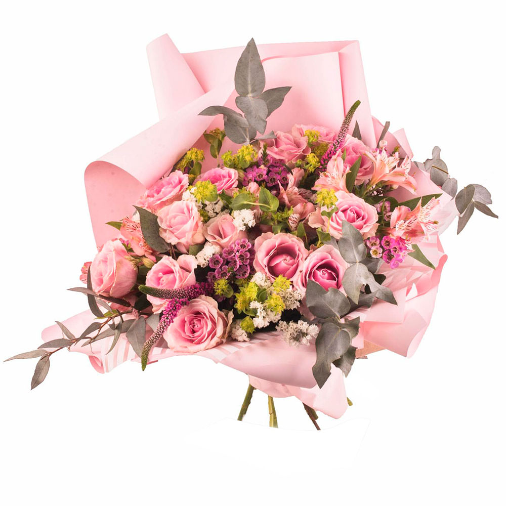 Роза одноголовая розовая, лимоникум, ваксфлауэр, вероника, эвкалипт. Упаковка (лента, пленка, крафт, сетка, пленка матовая)