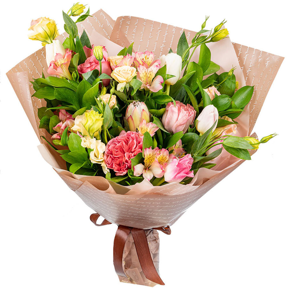 | Состав | Альстромерии, Гвоздики, Пионовидные розы, Протея, Розы, Тюльпаны, Эустомы |