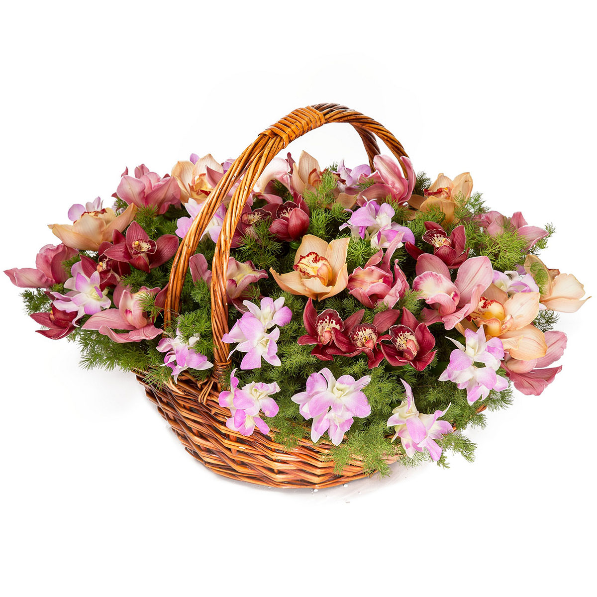 Орхидея разных цветов. Упаковка (Корзина, оазис, ящик).
