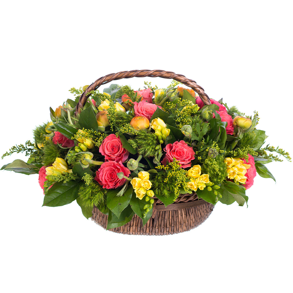 Роза одноголовая розовая, фрезия желтая, ранункулюс, солидаго, зелень. Упаковка (Корзина, оазис, ящик).