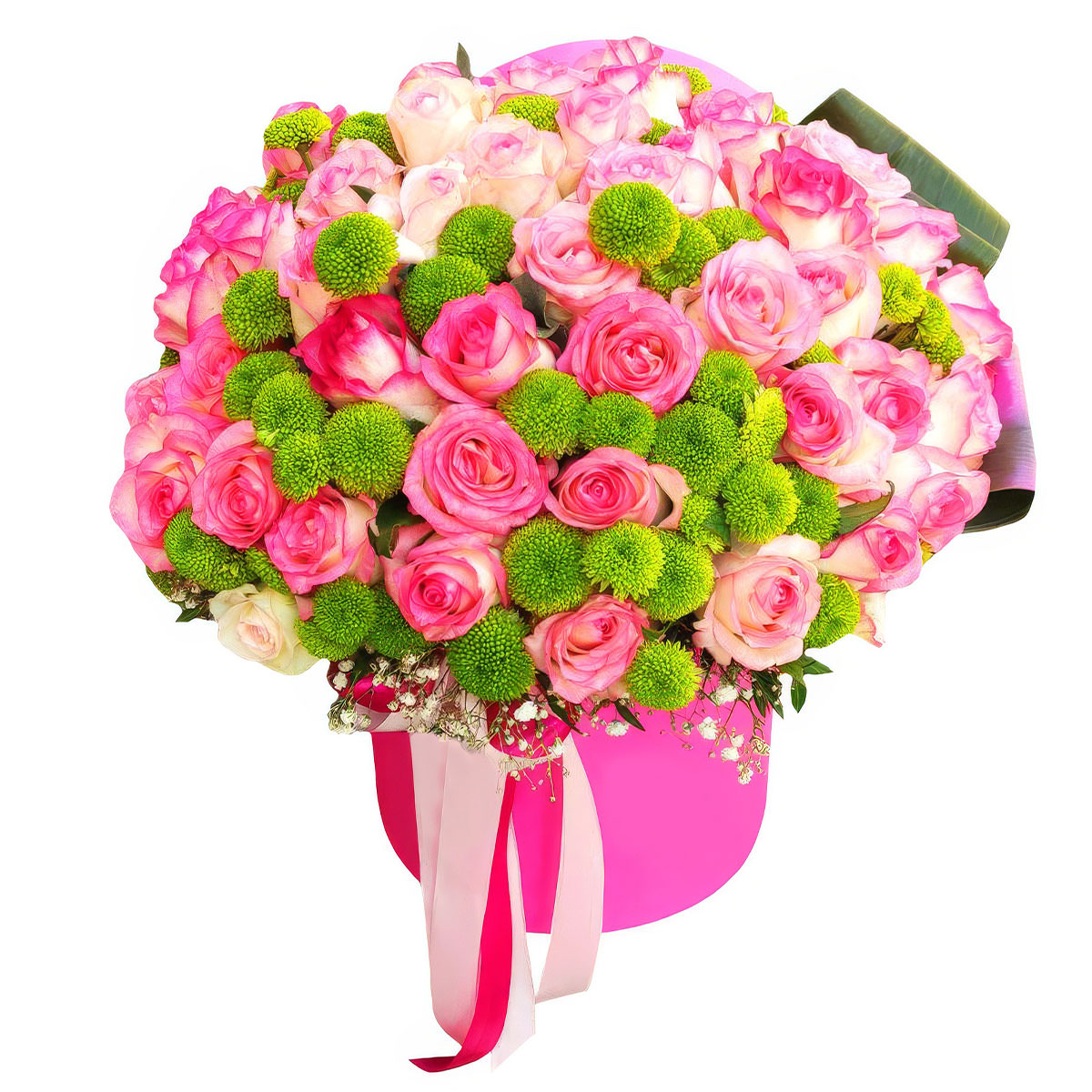 Роза одноголовая розовая, хризантема зеленая, аспидистра. Упаковка (шляпная коробка, квадратный бокс, коробка сердце, оазис)
