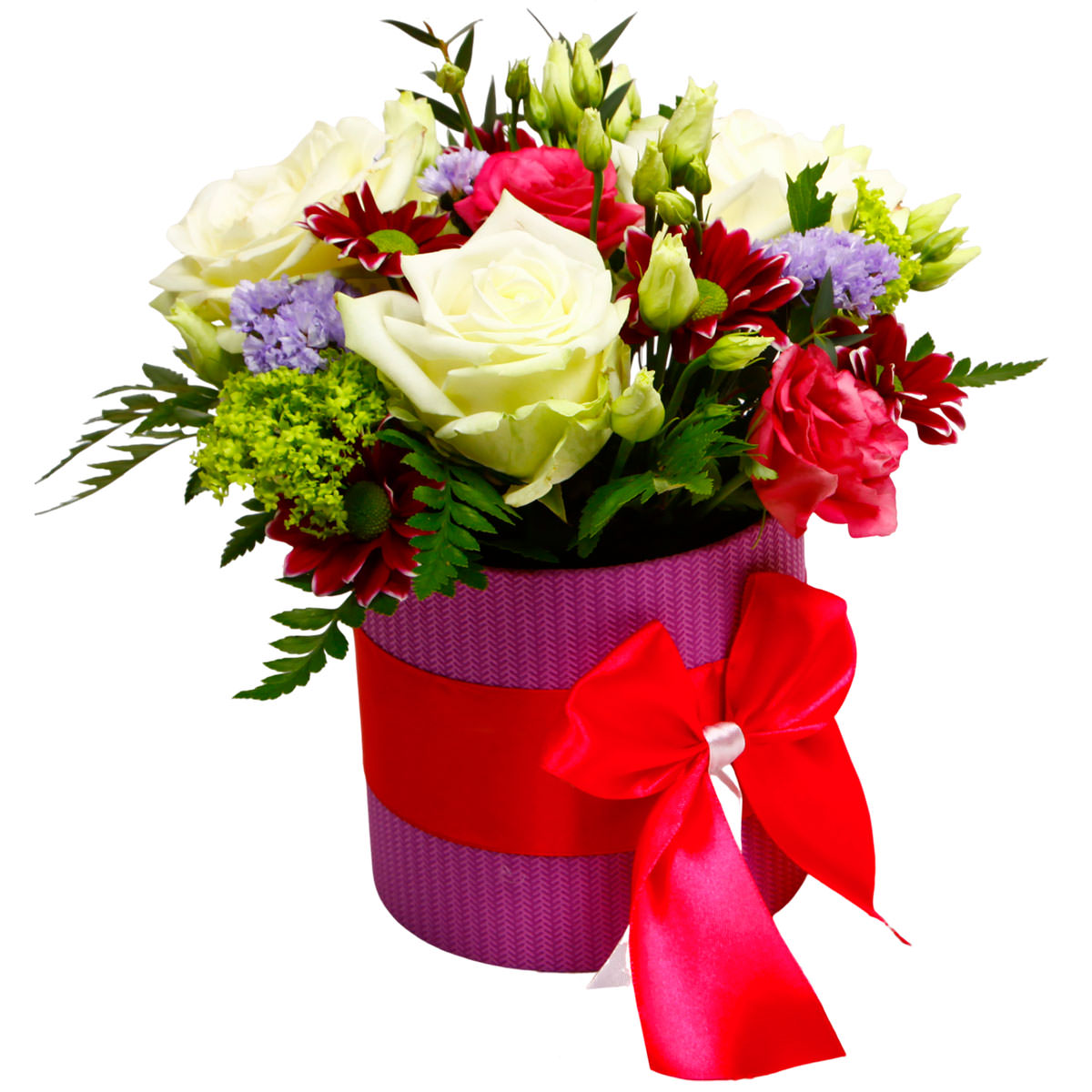 Роза одноголовая белая и розовая, хризантема кустовая бордовая, эустома розовая, статица, вибурнум, зелень. Упаковка (шляпная коробка, квадратный бокс, коробка сердце, оазис)