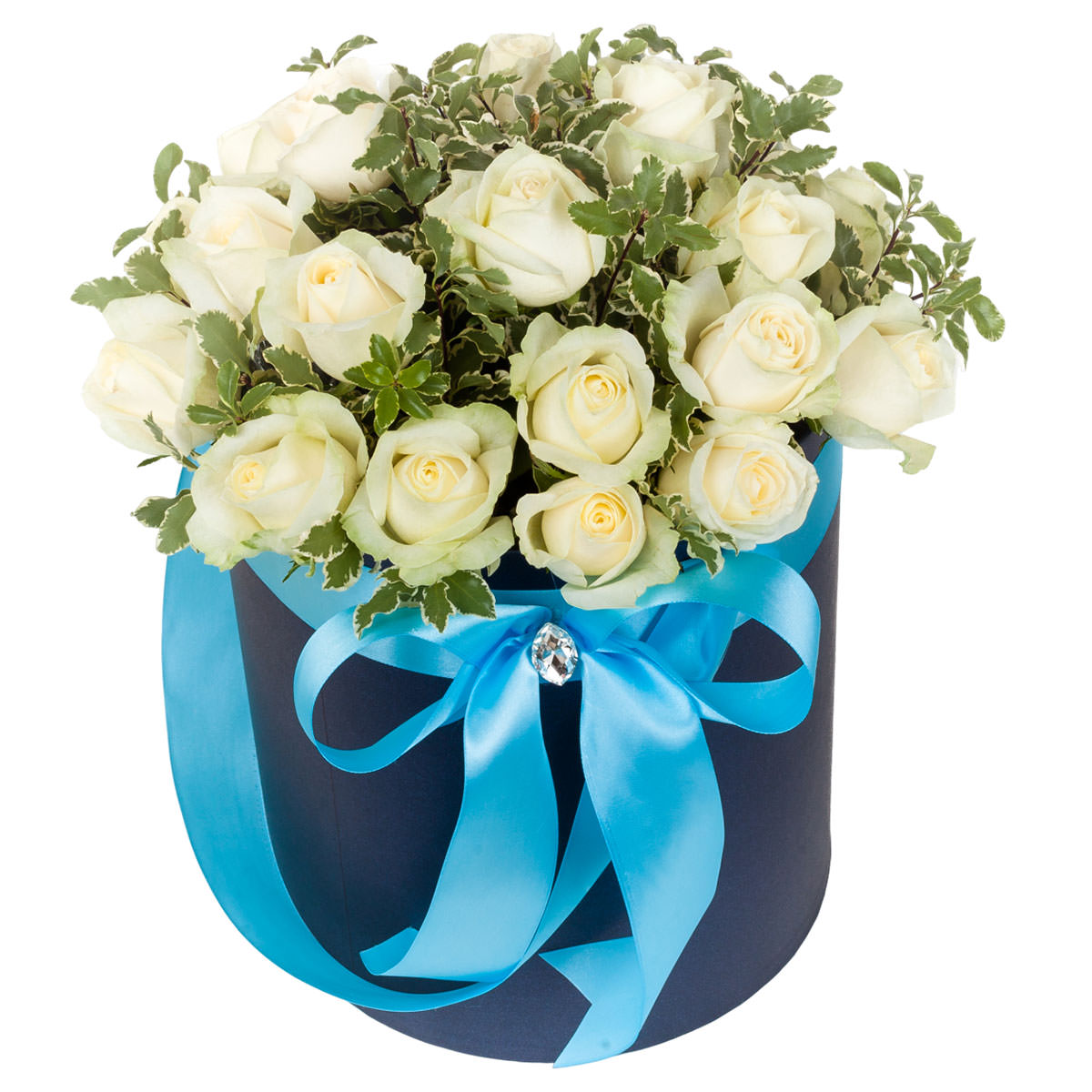 Роза одноголовая белая, зелень. Упаковка (шляпная коробка, квадратный бокс, коробка сердце, оазис)