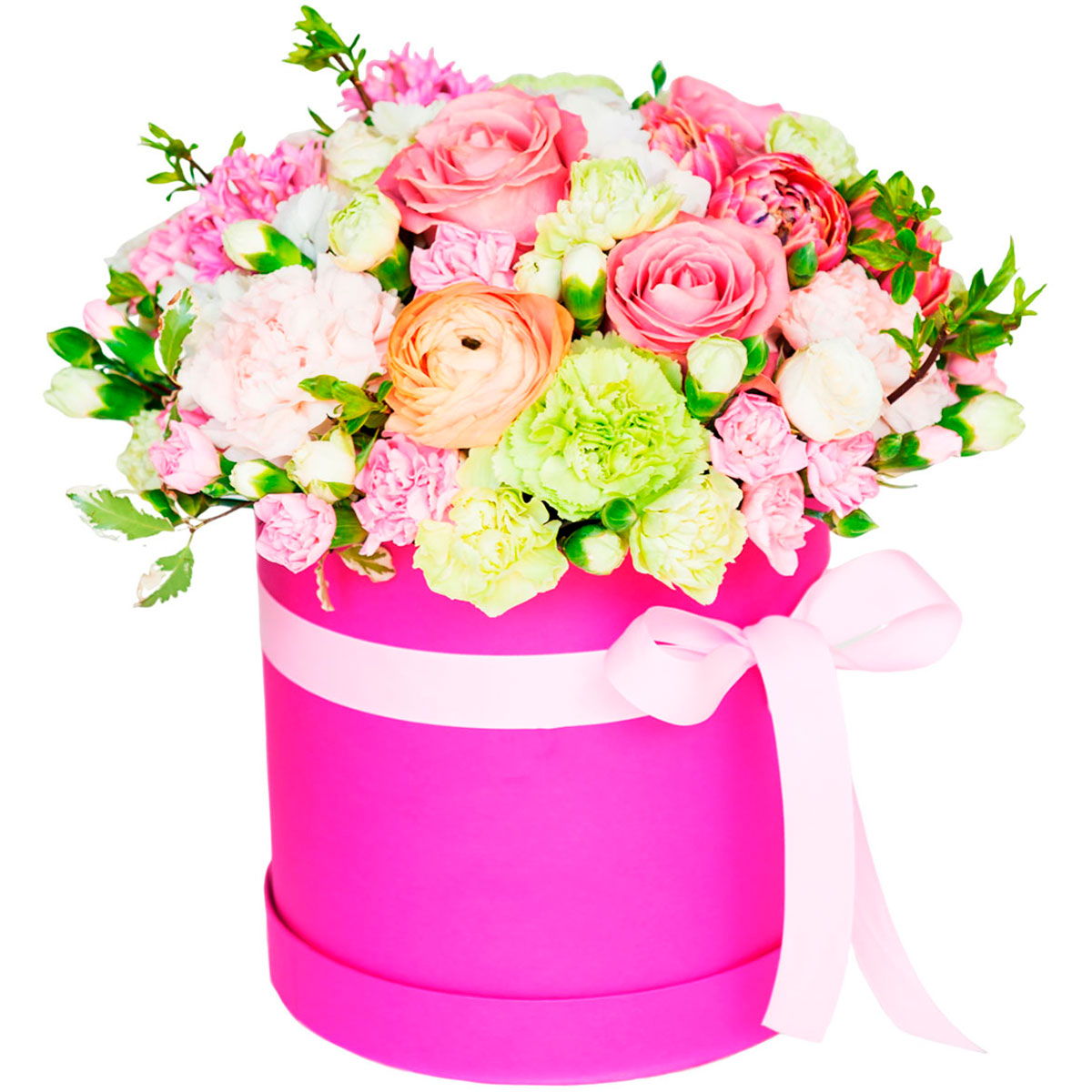 Роза одноголовая оранжевая, гиацинт розовый, ранункулюс персиковый, гвоздика зеленая, гвоздика мини розовая и белая, зелень. Упаковка (шляпная коробка, квадратный бокс, коробка сердце, оазис)