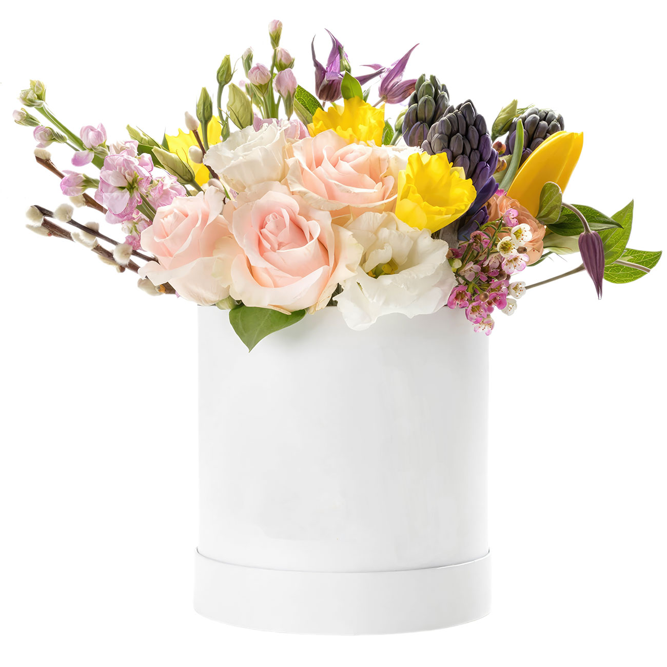 Роза одноголовая нежно-розовая, нарцисс, гиацинт, эустома белая, тюльпан желтый, маттиола сиреневая, ваксфлауэр, клематис, верба. Упаковка (шляпная коробка, квадратный бокс, коробка сердце, оазис)