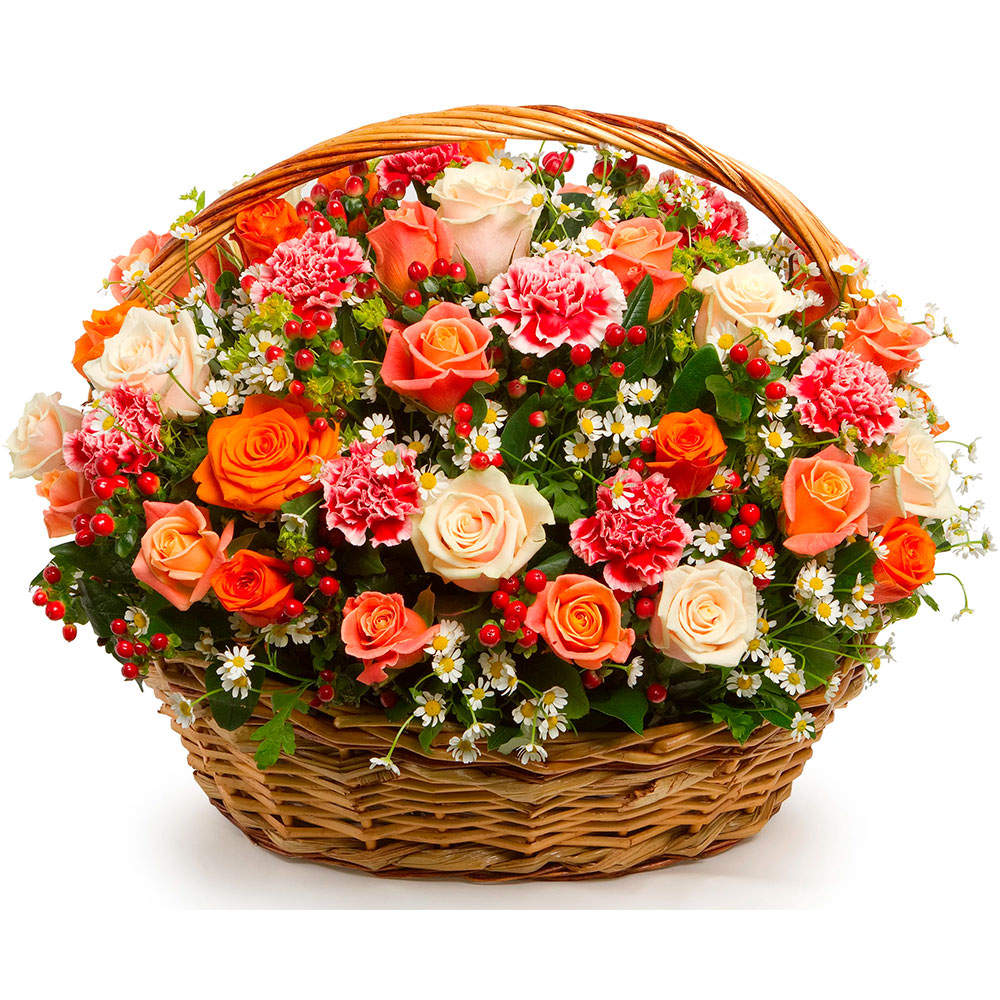 Роза одноголовая кремовая, роза кустовая оранжевая, гвоздика розовая, гиперикум, танацетум, зелень. Упаковка (Корзина, оазис).