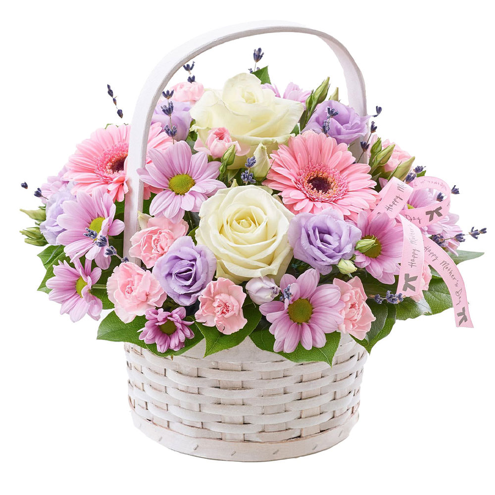 Роза одноголовая белая, хризантема кустовая сиреневая, гербера розовая, эустома сиреневая, гвоздика кустовая мини розовая, лаванда. Упаковка (Корзина, оазис).